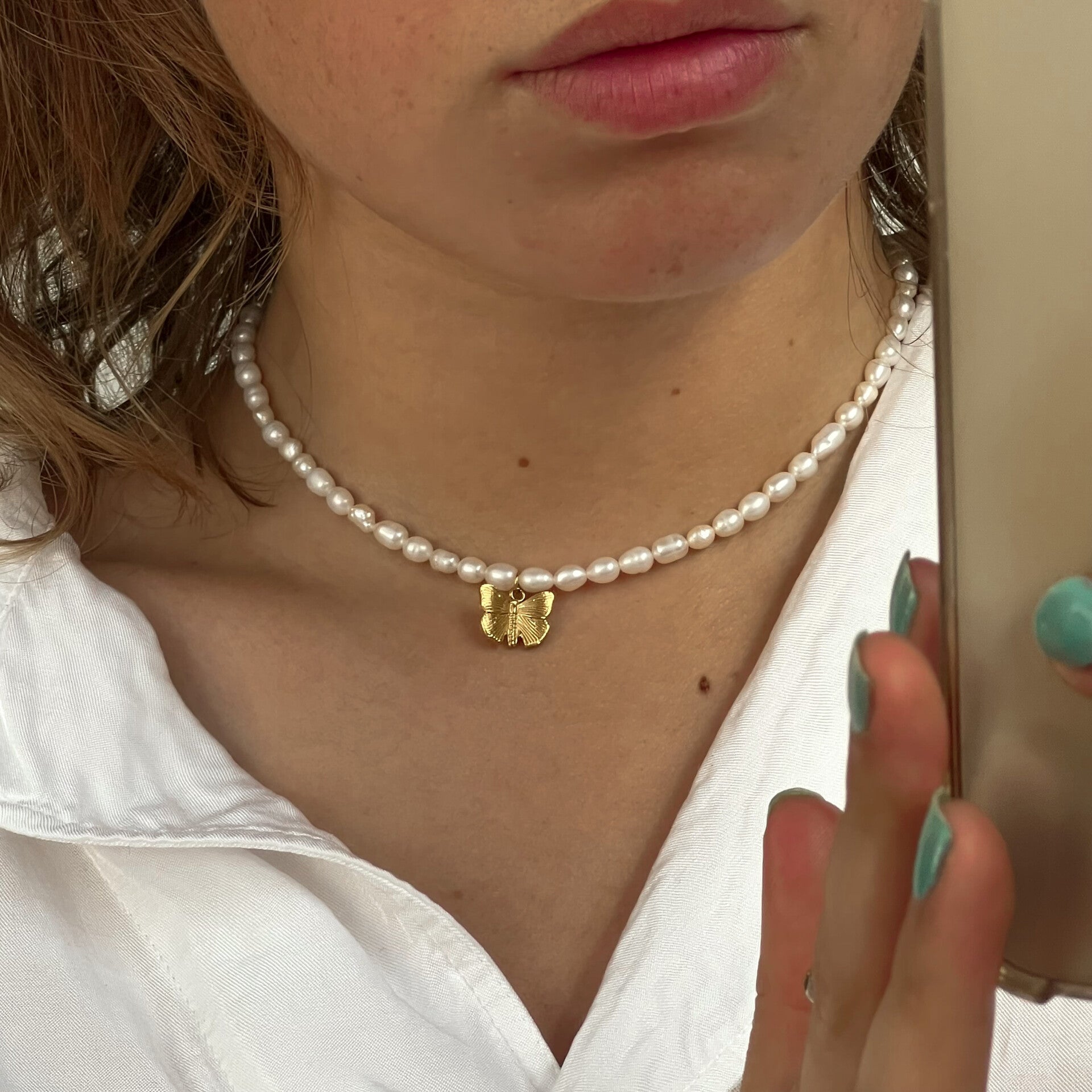 Je kent het parelkettinkje vast wel! Een van onze bestsellers! Nu hebben we ook een fantastische variant met vlinderbedel. De parels zijn echte zoetwaterparels en verschillen daardoor soms wat van vorm en kleur.